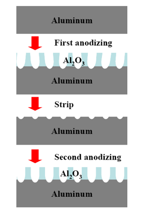 - 1차 양극산화 (Anodizing): 초기 알루미늄 산화막 형성